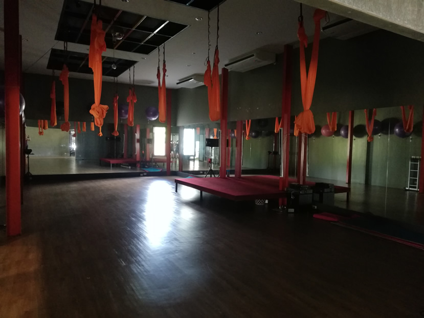 When I looked at the studio it was empty, but I saw some large air-conditioners which is promising! The studio is large, looks modern and contains step-boards, trampets, yoga mats, aerial yoga equipment and Swiss balls.