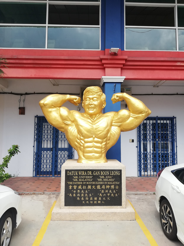 Boon Leong Gym is the most central of Melaka’s gyms that I found and is located at the end of Jonker Street (west side). It’s unmissable due to the statues of Datuk Wira Dr. Gan Boon Leong, a former award-winning bodybuilder who won various titles in his time.