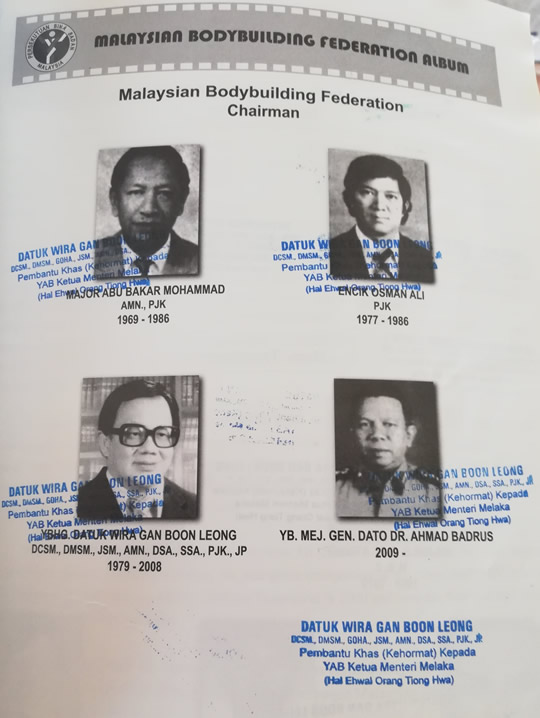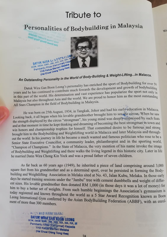 I don’t usually write a history section, as, let’s face it, most of the time we’re not too interested in the history of our gyms. However, the unmissable statues out the front are impossible to ignore, as are the numerous pics around the club. Datuk Wira Dr. Gan Boon Leong has won a stream of bodybuilding titles in his life – not only Mr Melaka, but also Mr Malaysia, Mr Asia and Mr Universe. Understandably his gym pays tribute to this with numerous photos and book of achievements. He went on to become a Malaysian Bodybuilding Federation Chairman, as well as a politician. It is said that he played a significant part in Melaka achieving its UNESCO World Heritage status.