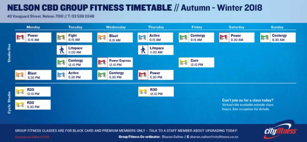 City Fitness Nelson additionally has a studio, the current class timetable of which is in the image gallery above. I counted 19 classes, which included titles such as Power, Fight, Blast, Active Centergy and Lifepace. I don’t think you’ll be dozing off in any of those!