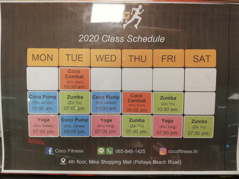 The lovely studio at Coco Fitness Pattaya is medium-large and currently hosts twelve classes a week. These are Coco Pump, Coco Combat, Zumba and Yoga. They run from Mon – Sat and most start at 10:00 or 19:00.