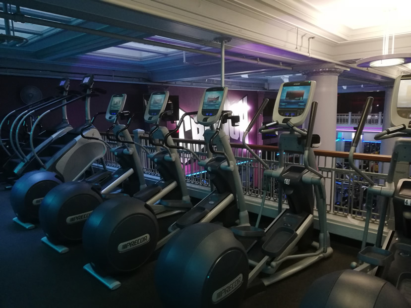Upstairs is relatively small and contains predominantly cardio machines around the edges of the room. This overlooks the main gym below. Machines include rowing machines, arc trainers, ellipticals, steppers, stairclimbers, bikes and treadmills. There is also a separate Spinning studio and small studio.
