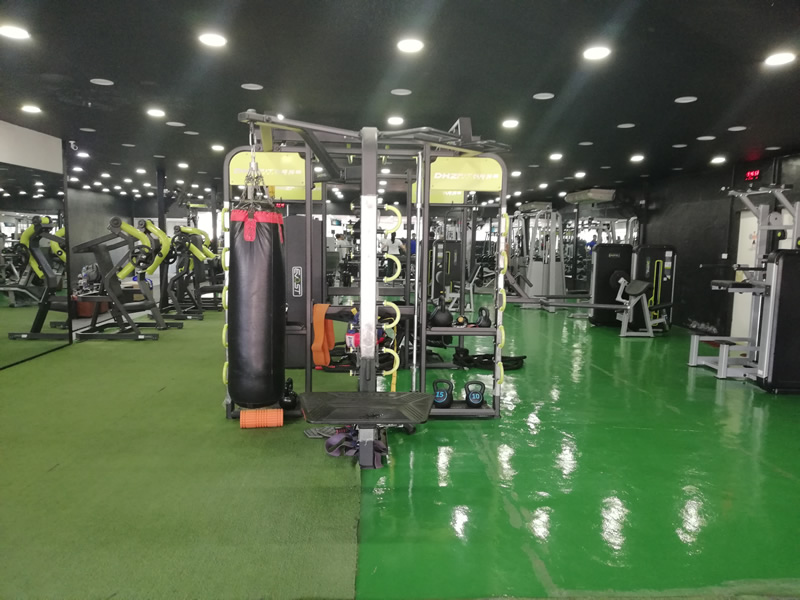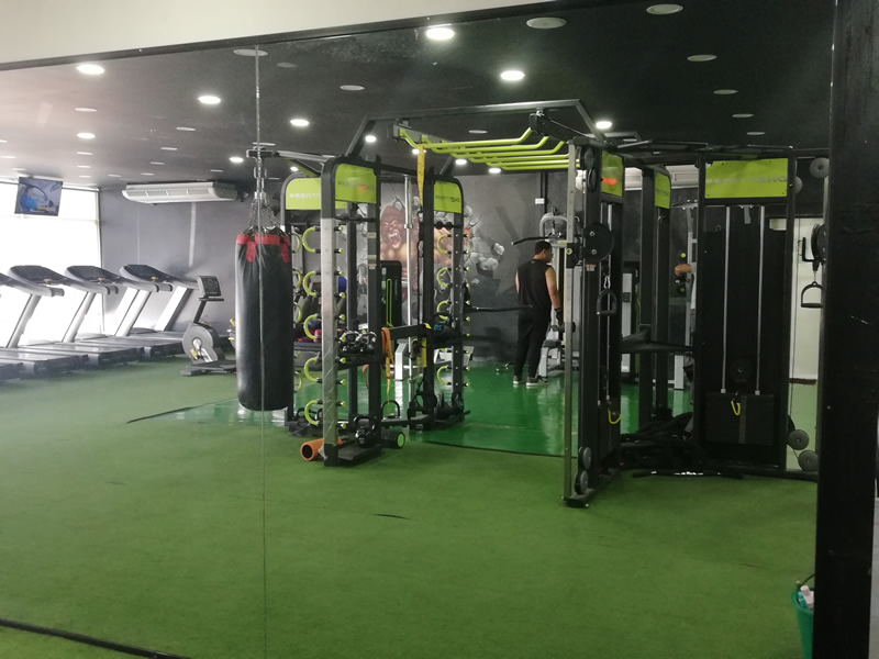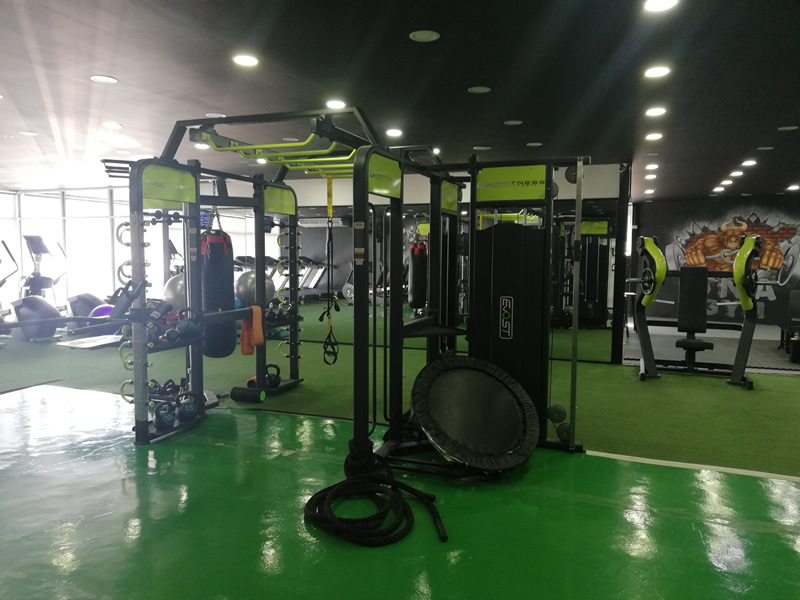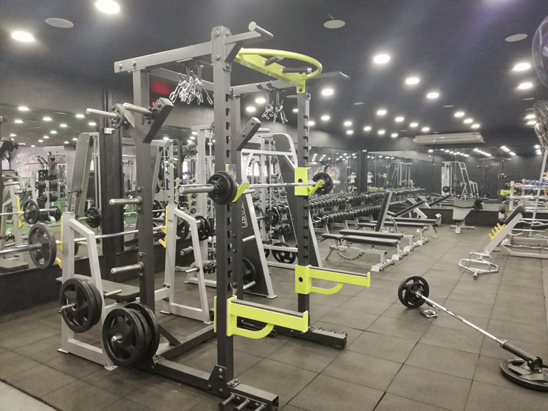 Lower body equipment includes a squat rack and Smith machine.