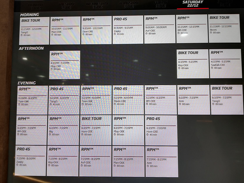 There is an attractive Spinning studio with an extensive timetable (see image) and a regular studio with a large range of Les Mills classes amongst others. These Include Body Jam, Body Step, Body Pump, Body Balance, Yoga, Pilates, Zumba, Core Abs, Freestyle Group Training (Power, Fusion and HIIT), Muay Fight Pro and “Obstacle” classes.