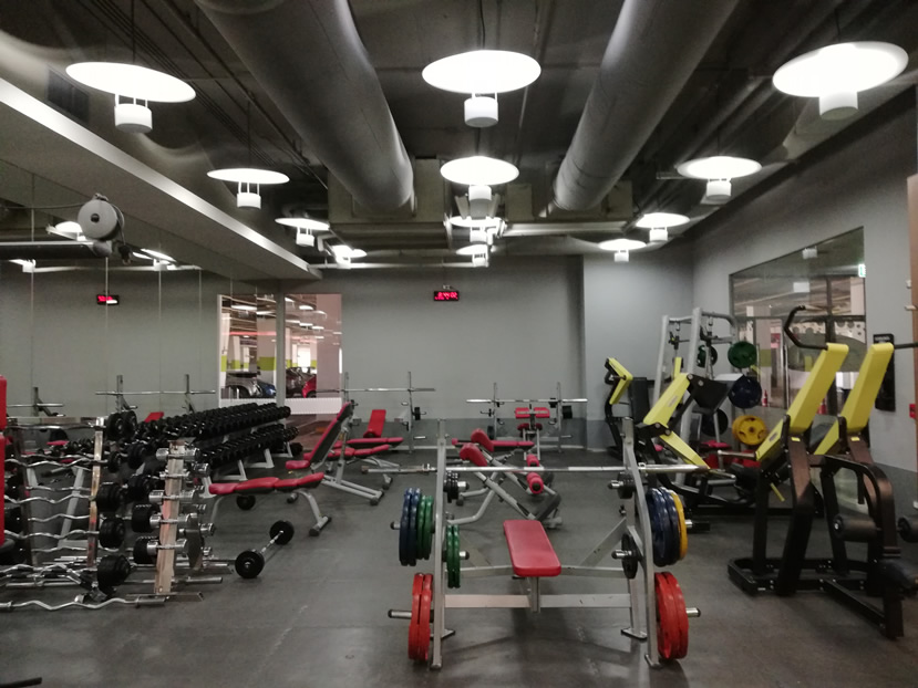Free weights are mostly in pounds and both dumbbells and barbells go up to 110lbs. There is a full rack of each of straight and curled barbells along with several adjustable ones. There are a couple of Smith machines, numerous benches, including flat and inclined ones with racks.