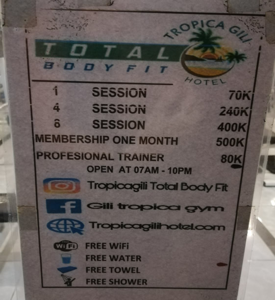 Gili Tropica Gym is well located at the centre of all the activity here on Gili Trawangan. You’ll find it very close to the pier on the east coast of the island. You’ll see a big banner across the street advertising “New Gym” so you can’t miss it! Alternatively, look out for “Tropica Gili Hotel” / “Total Body Fit” signs across the front of the building.