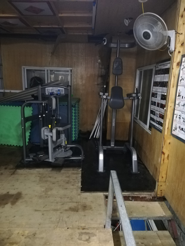 Ok, I won’t mince my words. This is very much a no frills gym. The floor is falling in – there are numerous cracks and breaks in it. There are gaps in the walls. The roof is leaking at the back, so the floor there is wet. The staircase is, well, interesting, and if you’re brave enough to climb it and do your free weights then it’ll be a bit of an experience. This building won’t be passing any surveys any time soon. It sure has character though!