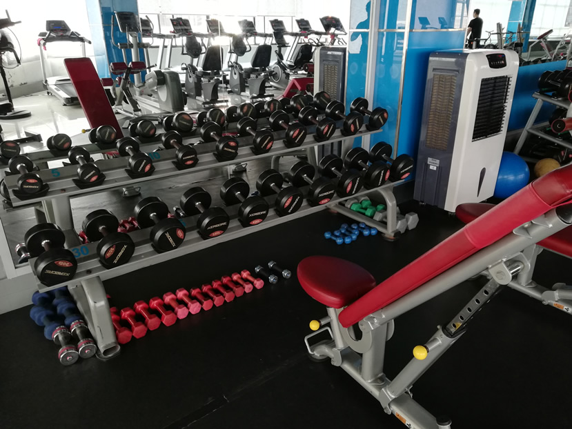 This medium sized gym is very attractive, modern and well-equipped. There are several aircon units around it and ample overhead fans and upright ones to keep the temperature at a comfortable level. Reception hosts a few cardio machines, before leading out in to the main gym area, where you’ll find everything else.