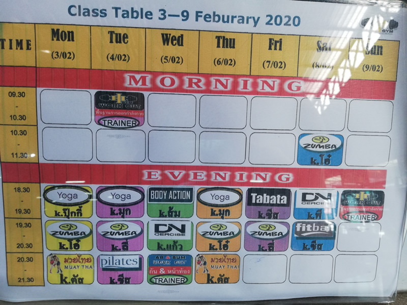 I counted 19 classes on the timetable, 17 of which are in the evenings from 18:30 – 21:30. The two morning classes are called Zumba and Trainer – not sure what the latter is all about!