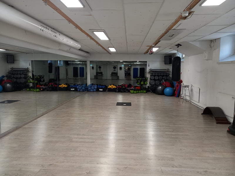 The medium-sized studio contains mats, boxing gloves and pads, punch-bags, lightweight dumbbells and lightweight adjustable barbells as well as…. yep, you guessed it – kettlebells.