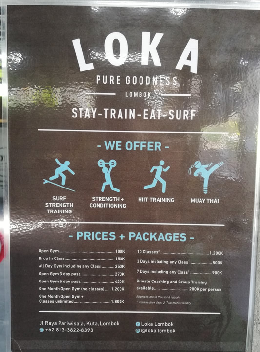 As this is my first gym in Lombok and indeed Indonesia, I’m not familiar yet with “normal” pricing. Loka Gym Lombok seems a little pricy at 100k, but then again this is an island AND it’s the only gym I found in Kuta. Compared to Western rates, it’s certainly cheap, but compared to other Asian countries I’ve visited lately it’s a little more expensive. Given the lovely modern facilities though, it’s a pleasure to use especially if you can stick your own tunes on – I’d happily return!