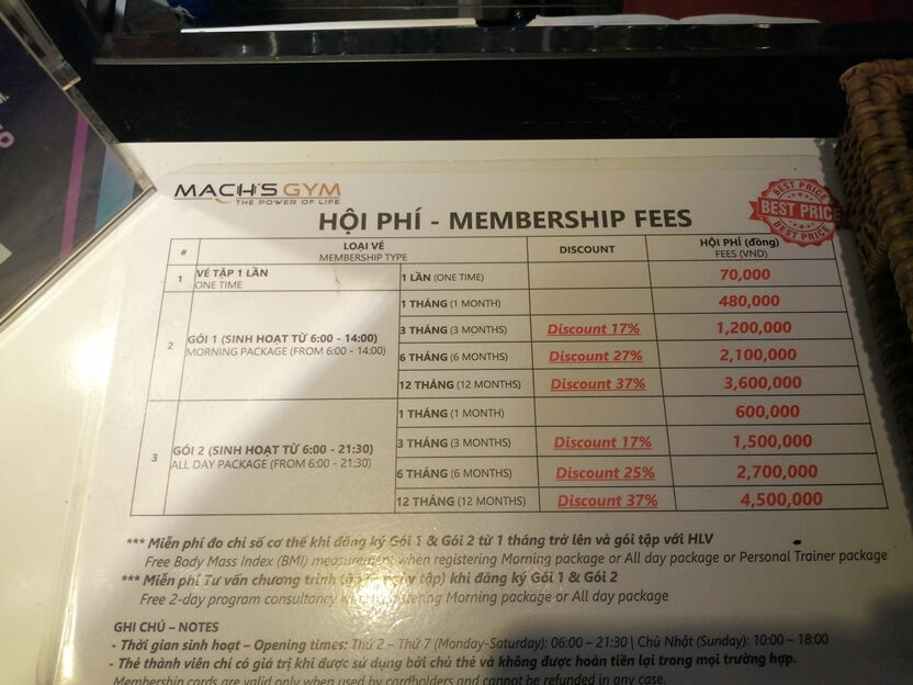 Cost: 80k dong per day or current offer: 480k per month if you train 6:00 – 14:00. Or 600k per month all day.