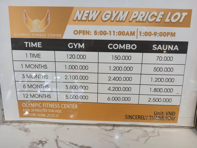If you’re looking for a gym in Hue, I recommend the Olympic Fitness Center Hue and would use it again if I went back there. Whilst you might find cheaper gyms further out, the location, range and quality of equipment and aircon made this well worth the money for me. Note that on Sundays it is not open in the mornings.