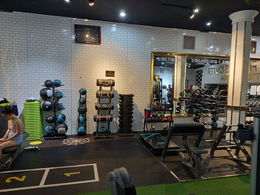 What I liked about Olympic Fitness Center Hue was that it’s a very spacious gym, with a dedicated floor space area. You’ll also a find a fair amount of functional training equipment, including a variety of medicine balls, kettle bells, Swiss balls and power packs. There are also a couple of stepboards, BOSUs, plyoboxes, a large tyre and a couple of foam rollers.