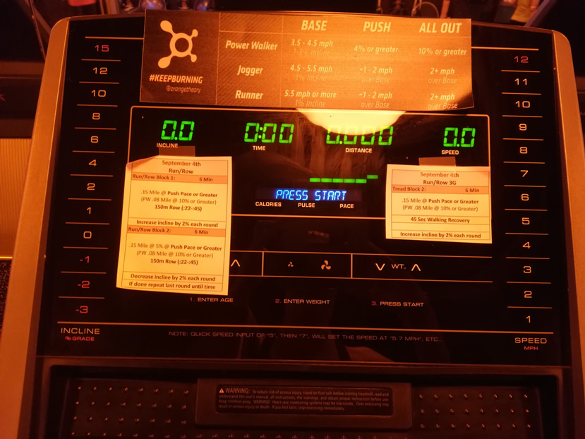 These are very simple to operate – you simply select the incline and the speed. At any given moment, the instructor will indicate whether you should be working in “Base”, “Push” or “All-out” and there are handy little tables on each treadmill, indicating the advised speeds for Base mode in each of the Power-walker, Jogger and Runner categories. It also specifies how much faster you should be running in Push and All-out modes. Simple? In (Orange)theory yes; in practice not quite!