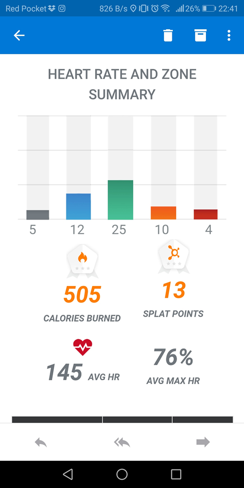 At the end of the class, you can check the screen to see how many calories you’ve burnt, your average heard rate and number of Splat Points. (This is how long you spent in amber and red zones, NOT how many times you fell off the treadmill.) You can also view your distribution of time, in terms of how long you spent working at your maximum. You’ll also get an automatic email at the end of each class with this data.