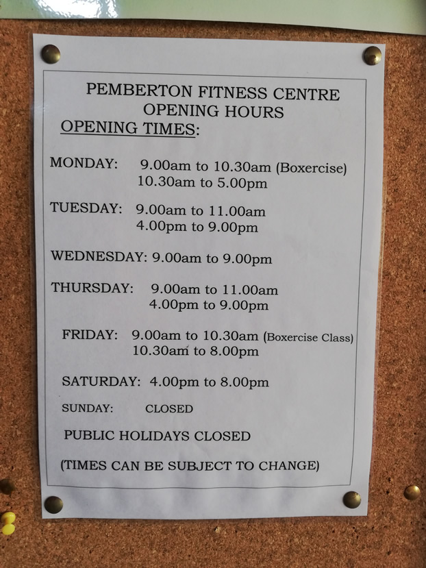 Opening Hours:Pemberton Fitness Centre Opening Hours