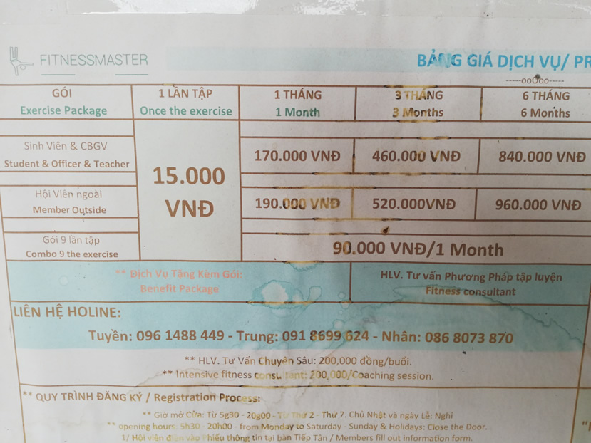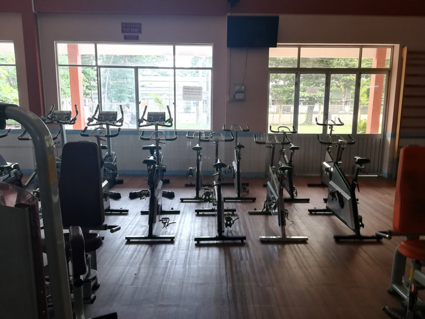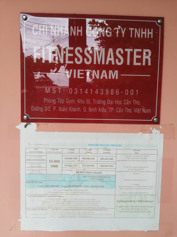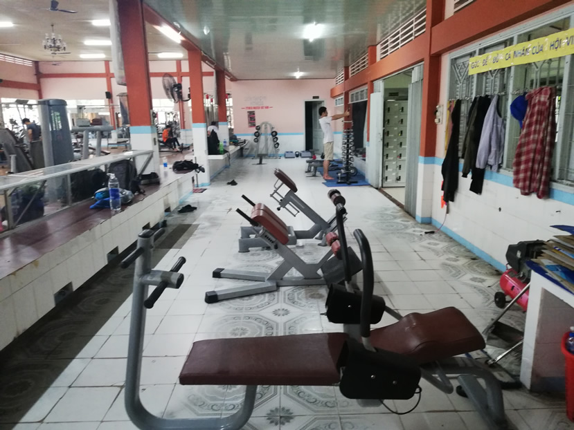 The gym is located centrally in Can Tho and is indeed correct on Google Maps – unlike many things in Vietnam as I write this! It’s called Phong Tap Gym_CTU on there. If you’re walking from the city, the last few minutes are along peaceful green streets away from the usual city noise. You’d be forgiven for smiling inanely when you see the sign outside with prices on it. Yes, you have understood their cute use of English correctly – it is indeed a mere 15k dong / 50p for a workout! Woohoo.