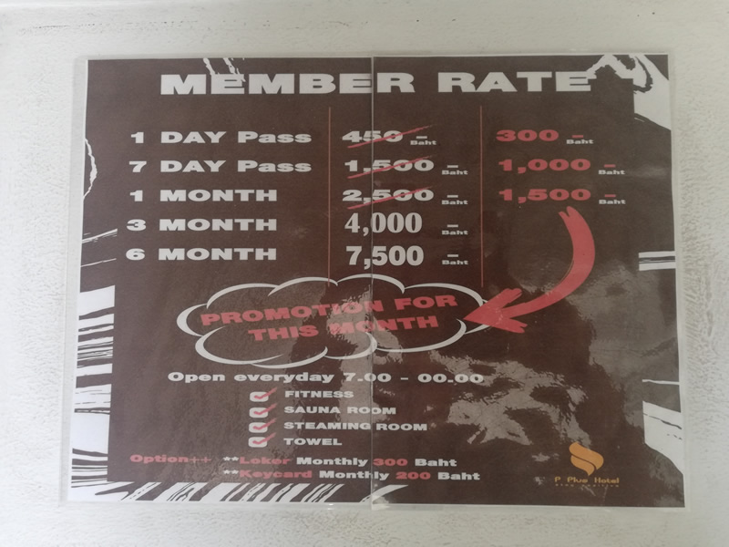 When I arrived late morning, the gym was a reasonable temperature, but cooled by fans only. They do have aircon though, and the sign by it said that it’s switched on from 12:00 – 20:00. It was actually closer to to 13:00 by the time anyone put it on, around the same time as a surge of customers came in. So yes, they do switch it on, in Thai time!