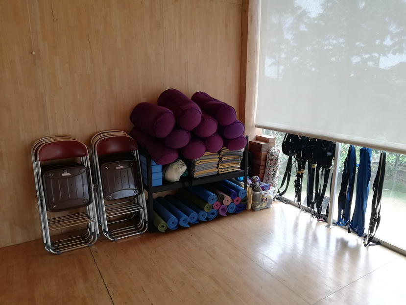 The upstairs studio contains a good number of yoga mats, equipment for aerial yoga, blocks and TRXs.