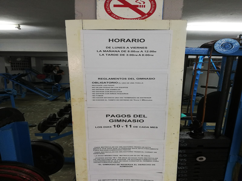 Around the gym, you’ll see signs in Spanish telling you not to leave weights on the machines – you need to return them to the racks. Presumably because there wouldn’t be enough discs to go around if you left them there. There are even more interesting signs up, telling you not to smoke there or bring bikes, animals or small children into the gym. Cubans like their rules. I was amused by these so I translated the others too.