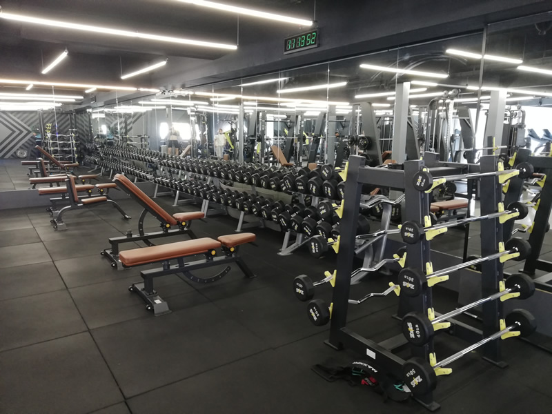 The spacious and attractive free weights section here at Workout Club is well-equipped with both barbells and dumbbells. You’ll find a full set of dumbbells up to 100lbs, all perfectly racked in order. Alongside, there’s a rack of both straight and curled barbells from 10 – 50lbs in 10lb increments. You’ll find plenty of benches here and better still, ample space between them to train.